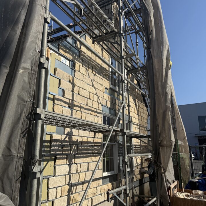 まだ足場の養生シートが貼られていますが